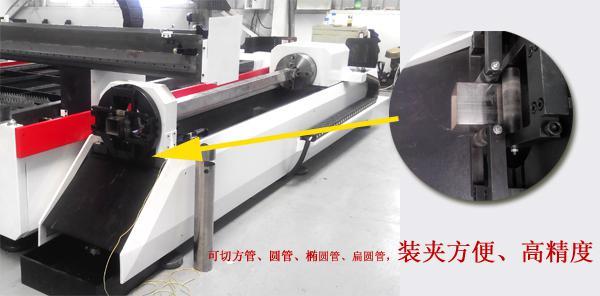 為滿足用戶進行金屬管材的相貫線切割以及鋼板的異形切割下料,我公司研發生產了(組合型)管板一體光纖激光切割機,原理是:將相貫線切割專用部件,配置到激光切割機工作臺的側面,來完成管材的相貫線與平面金屬板材的互換切割。其特點:當批量不大時實現一機多用(金屬管材及金屬板材的激光切割),從而得到一機兩用、減少了設備數量的投入和場地面積的占用。